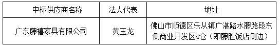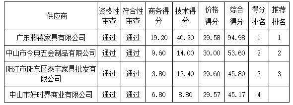 投標(biāo)結(jié)果:最終評標(biāo)委員會一致推薦 廣東藤禧家具有限公司 為中標(biāo)單位,中標(biāo)金額為人民幣 577882.00 元,(大寫金額: 伍拾柒萬柒仟捌佰捌拾貳元整 )。
