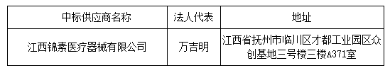 投標(biāo)結(jié)果:最終評(píng)標(biāo)委員會(huì)一致推薦 江西錦素醫(yī)療器械有限公司 為中標(biāo)單位,中標(biāo)金額為人民幣 301400.00 元,(大寫(xiě)金額: 叁拾萬(wàn)零壹仟肆佰元整 )。