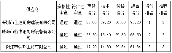 投標(biāo)結(jié)果:最終評標(biāo)委員會一致推薦 深圳市佳達(dá)廚房建設(shè)有限公司 為中標(biāo)單位,中標(biāo)金額為人民幣 216800.00 元,(大寫金額: 貳拾壹萬陸仟捌佰元整 )。