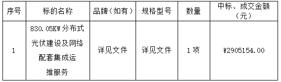 廣東業(yè)信招標(biāo)有限公司受 陽江市睿明新能源有限公司 的委托,于2025年6月25日就 陽江市睿明新能源有限公司830.05KW分布式光伏建設(shè)項目 (項目編號:YXZB-20250619)采用公開比選方式進(jìn)行采購?,F(xiàn)就本次采購的成交結(jié)果公告如下: