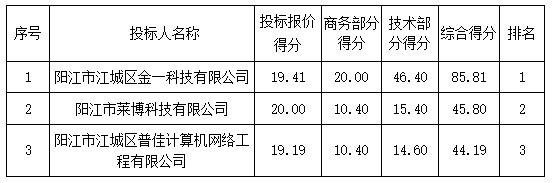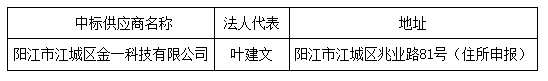 投標(biāo)結(jié)果:最終評(píng)標(biāo)委員會(huì)一致推薦 陽(yáng)江市江城區(qū)金一科技有限公司 為中標(biāo)單位,中標(biāo)金額為人民幣 195000.00 元,(大寫(xiě)金額: 壹拾玖萬(wàn)伍仟元整 )。