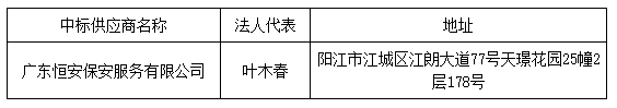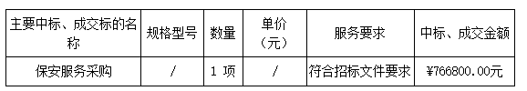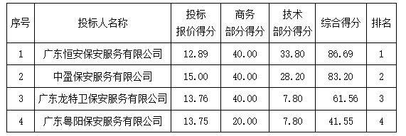 投標(biāo)結(jié)果:最終評標(biāo)委員會一致推薦 廣東恒安保安服務(wù)有限公司 為預(yù)中標(biāo)單位,中標(biāo)金額為人民幣 766800.00 元,(大寫金額: 柒拾陸萬陸仟捌佰元整 ) 。