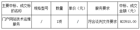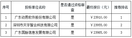 談判結(jié)果:最終談判小組一致推薦 廣東動(dòng)易軟件股份有限公司 為成交單位,成交金額為人民幣 23910.00 元(大寫金額: 貳萬叁仟玖佰壹拾元整 )。