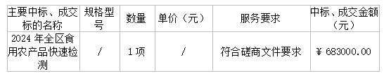 廣東業(yè)信采購(gòu)招標(biāo)有限公司受 陽(yáng)江市市場(chǎng)監(jiān)督管理局陽(yáng)東分局 的委托,于2024年6月11日就 陽(yáng)江市市場(chǎng)監(jiān)督管理局陽(yáng)東分局2024年全區(qū)食用農(nóng)產(chǎn)品快速檢測(cè)采購(gòu)項(xiàng)目(項(xiàng)目編號(hào):YXCG-20240520)采用競(jìng)爭(zhēng)性磋商方式進(jìn)行采購(gòu)?,F(xiàn)就本次采購(gòu)的成交結(jié)果公告如下: