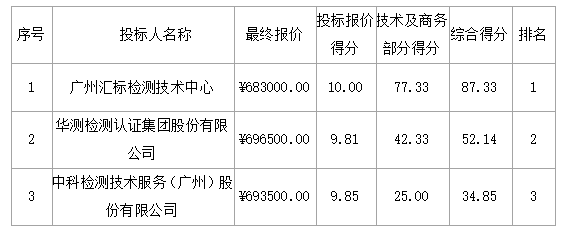 磋商結(jié)果:最終磋商小組一致推薦 廣州匯標(biāo)檢測(cè)技術(shù)中心 為成交單位,成交金額為人民幣 683000.00元,(大寫金額: 陸拾捌萬(wàn)叁仟元整 )。