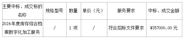 廣東業(yè)信采購招標(biāo)有限公司受 陽江市江城區(qū)人民檢察院 的委托,于2024年6月25日就 陽江市江城區(qū)人民檢察院2024年度庫存綜合檔案數(shù)字化加工服務(wù)項(xiàng)目(項(xiàng)目編號:YXCG-20240516)采用公開招標(biāo)方式進(jìn)行采購。現(xiàn)就本次采購的中標(biāo)結(jié)果公告如下: