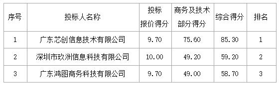 投標(biāo)結(jié)果:最終評標(biāo)委員會一致推薦 廣東芯創(chuàng)信息技術(shù)有限公司 為預(yù)中標(biāo)單位,中標(biāo)金額為人民幣 357000.00 元,(大寫金額: 叁拾伍萬柒仟元整 ) 。