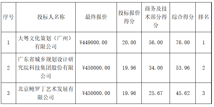 磋商結(jié)果:最終磋商小組一致推薦 大粵文化策劃(廣州)有限公司 為成交單位,成交金額為人民幣 449000.00元,(大寫金額:肆拾肆萬玖仟元整 )。