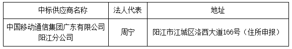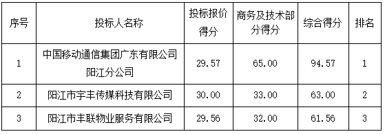 投標(biāo)結(jié)果:最終評(píng)標(biāo)委員會(huì)一致推薦 中國(guó)移動(dòng)通信集團(tuán)廣東有限公司陽江分公司 為中標(biāo)單位,中標(biāo)金額為人民幣 559535.00 元,(大寫金額: 伍拾伍萬玖仟伍佰叁拾伍元整 )。