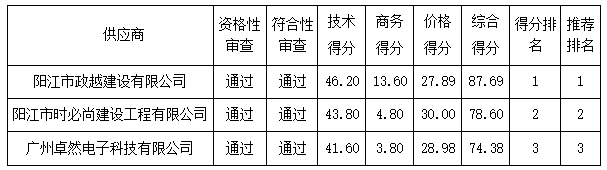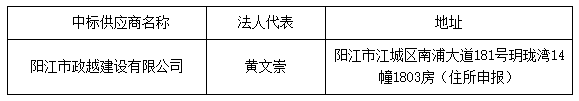 投標結果:最終評標委員會一致推薦 陽江市政越建設有限公司 為中標單位,中標金額為人民幣 205480.00 元,(大寫金額: 貳拾萬零伍仟肆佰捌拾元整 )。