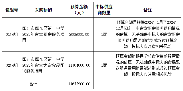 廣東業(yè)信采購招標(biāo)有限公司受 陽江市陽東區(qū)第二中學(xué) 的委托,于2025年7月22日就 陽江市陽東區(qū)第二中學(xué)2025年食堂廚房服務(wù)及大宗食品配送服務(wù)項目(項目編號:YXCG-20250626)采用公開招標(biāo)方式進行采購?,F(xiàn)就本次采購的中標(biāo)結(jié)果公告如下: