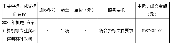 廣東業(yè)信采購招標(biāo)有限公司受 陽江技師學(xué)院 的委托,于2024年8月6日就 陽江技師學(xué)院2024年機(jī)電、汽車、計(jì)算機(jī)等專業(yè)實(shí)習(xí)實(shí)訓(xùn)材料采購項(xiàng)目(項(xiàng)目編號:YXCG-20240607)采用公開招標(biāo)方式進(jìn)行采購。現(xiàn)就本次采購的中標(biāo)結(jié)果公告如下:
