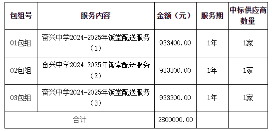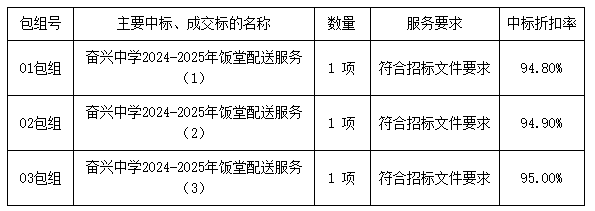 廣東業(yè)信采購招標有限公司受 陽西縣奮興中學 的委托,于2024年8月16日就 奮興中學2024-2025年飯?zhí)门渌头?wù)項目(項目編號:YXCG-20240726)采用公開招標方式進行采購?,F(xiàn)就本次采購的中標結(jié)果公告如下: