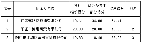 投標(biāo)結(jié)果:最終評(píng)標(biāo)委員會(huì)一致推薦 廣東漠陽(yáng)花糧油有限公司 為預(yù)中標(biāo)單位,中標(biāo)金額為人民幣 1800.00 元/噸/年,(大寫金額: 壹仟捌佰元整 ) ,中標(biāo)總金額為人民幣 672000.00 元,(大寫金額: 陸拾柒萬(wàn)貳仟元整 )。