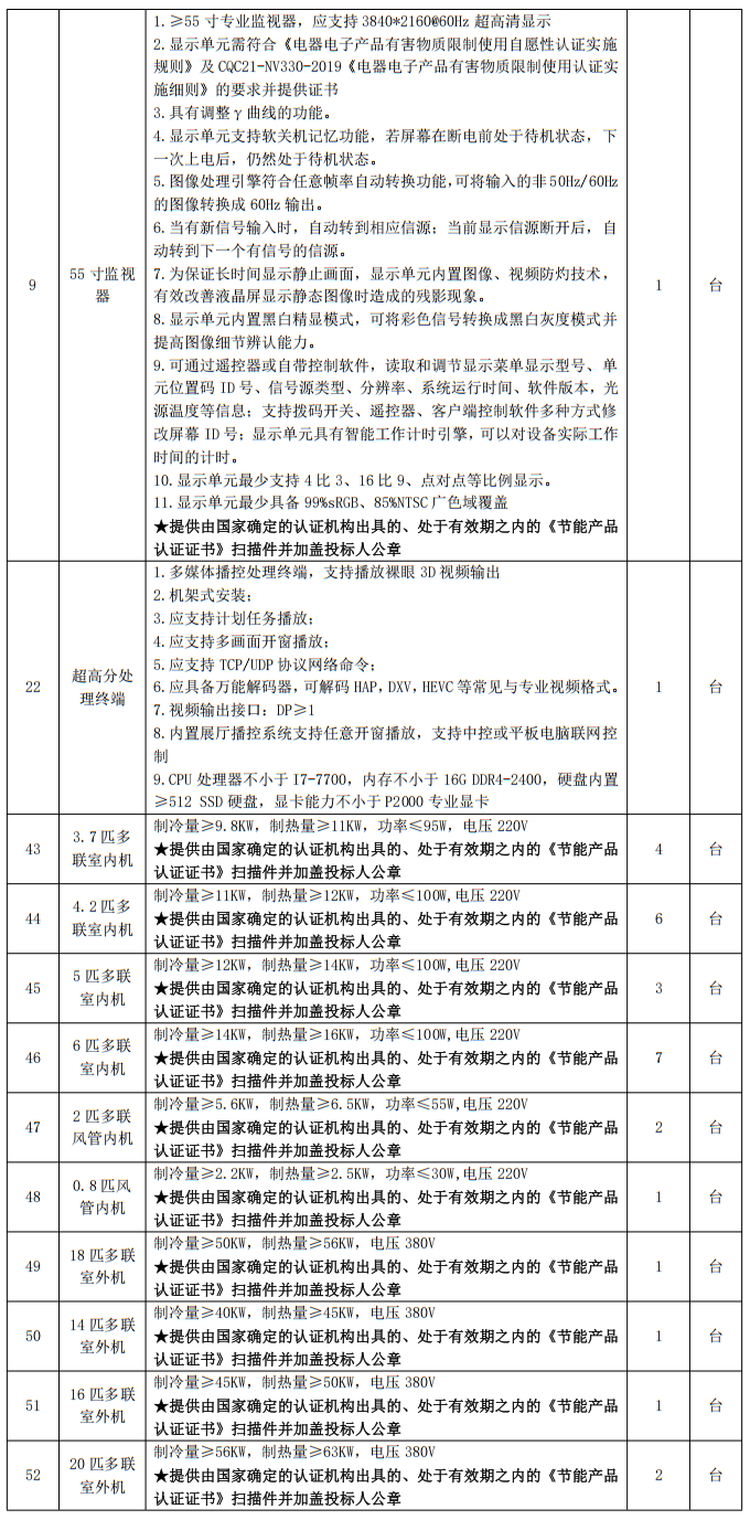 注:★采購人擬采購的產(chǎn)品屬于《節(jié)能產(chǎn)品政府采購品目清單》范圍中政府強制采購產(chǎn)品類別的,投標人須在投標文件中提供:該產(chǎn)品獲得的由國家確定的認證機構(gòu)出具的、處于有效期之內(nèi)的節(jié)能產(chǎn)品認證證書(注:《節(jié)能產(chǎn)品政府采購品目清單》投標人可查詢中國政府采購網(wǎng),網(wǎng)址http://www.ccgp.gov.cn;)。本項目中屬于政府強制采購節(jié)能產(chǎn)品目錄清單的設(shè)備