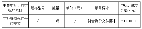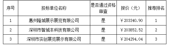 報(bào)價結(jié)果:最終詢價小組一致推薦 惠州隆城展示展覽有限公司 為成交單位,成交金額為人民幣 203340.90 元(大寫金額: 貳拾萬零叁仟叁佰肆拾元玖角整 )。