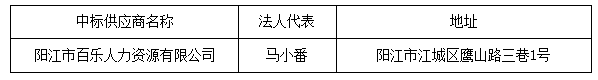投標(biāo)結(jié)果:最終評標(biāo)委員會一致推薦 陽江市百樂人力資源有限公司 為預(yù)中標(biāo)單位,中標(biāo)金額為人民幣 1427827.00 元,(大寫金額: 壹佰肆拾貳萬柒仟捌佰貳拾柒元整 ) 。
