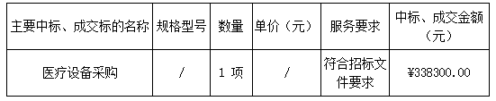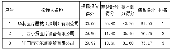 投標(biāo)結(jié)果:最終評標(biāo)委員會一致推薦 華潤醫(yī)療器械(深圳)有限公司 為中標(biāo)單位,中標(biāo)金額為人民幣 338300.00 元,(大寫金額: 叁拾叁萬捌仟叁佰元整 )。