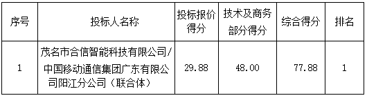 比選結果:最終比選小組一致推薦 茂名市合信智能科技有限公司/中國移動通信集團廣東有限公司陽江分公司(聯(lián)合體) 為成交單位,成交金額為人民幣 18622050.00元,(大寫金額: 壹仟捌佰陸拾貳萬貳仟零伍拾元整 )。