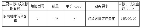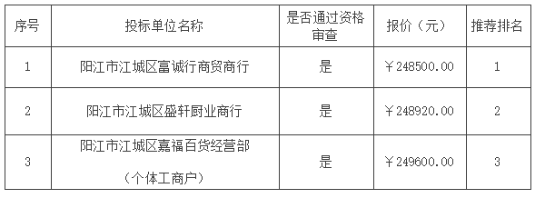 報(bào)價(jià)結(jié)果:最終詢價(jià)小組一致推薦 陽(yáng)江市江城區(qū)富誠(chéng)行商貿(mào)商行 為成交單位,成交金額為人民幣 248500.00 元(大寫(xiě)金額: 貳拾肆萬(wàn)捌仟伍佰元整 )。