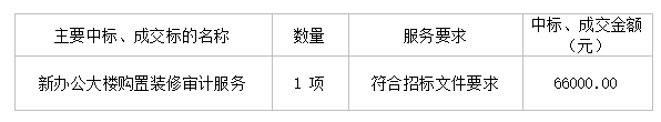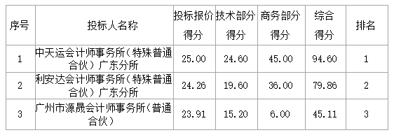 投標(biāo)結(jié)果:最終評標(biāo)委員會一致推薦 中天運(yùn)會計師事務(wù)所(特殊普通合伙)廣東分所 為預(yù)中標(biāo)單位,中標(biāo)金額為人民幣 66000.00 元,(大寫金額: 陸萬陸仟元整 ) 。