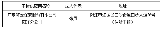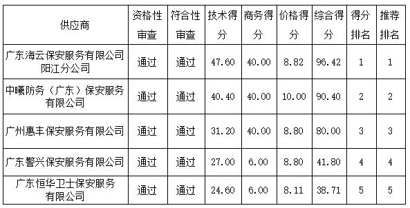 注:廣東海云保安服務(wù)有限公司陽江分公司、中曦防務(wù)(廣東)保安服務(wù)有限公司、廣州惠豐保安服務(wù)有限公司、廣東警興保安服務(wù)有限公司提供《中小微企業(yè)聲明函》,為小型企業(yè),價(jià)格扣除10%。