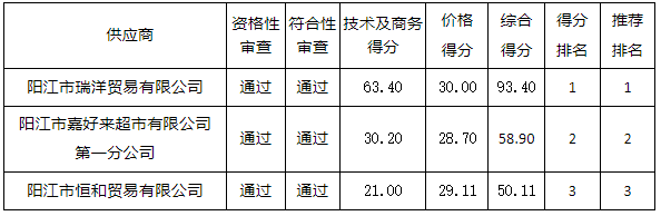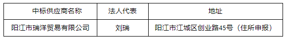 投標(biāo)結(jié)果:最終評標(biāo)委員會一致推薦 陽江市瑞洋貿(mào)易有限公司 為中標(biāo)單位,中標(biāo)金額為人民幣 497950.00 元,(大寫金額: 肆拾玖萬柒仟玖佰伍拾元整 )。